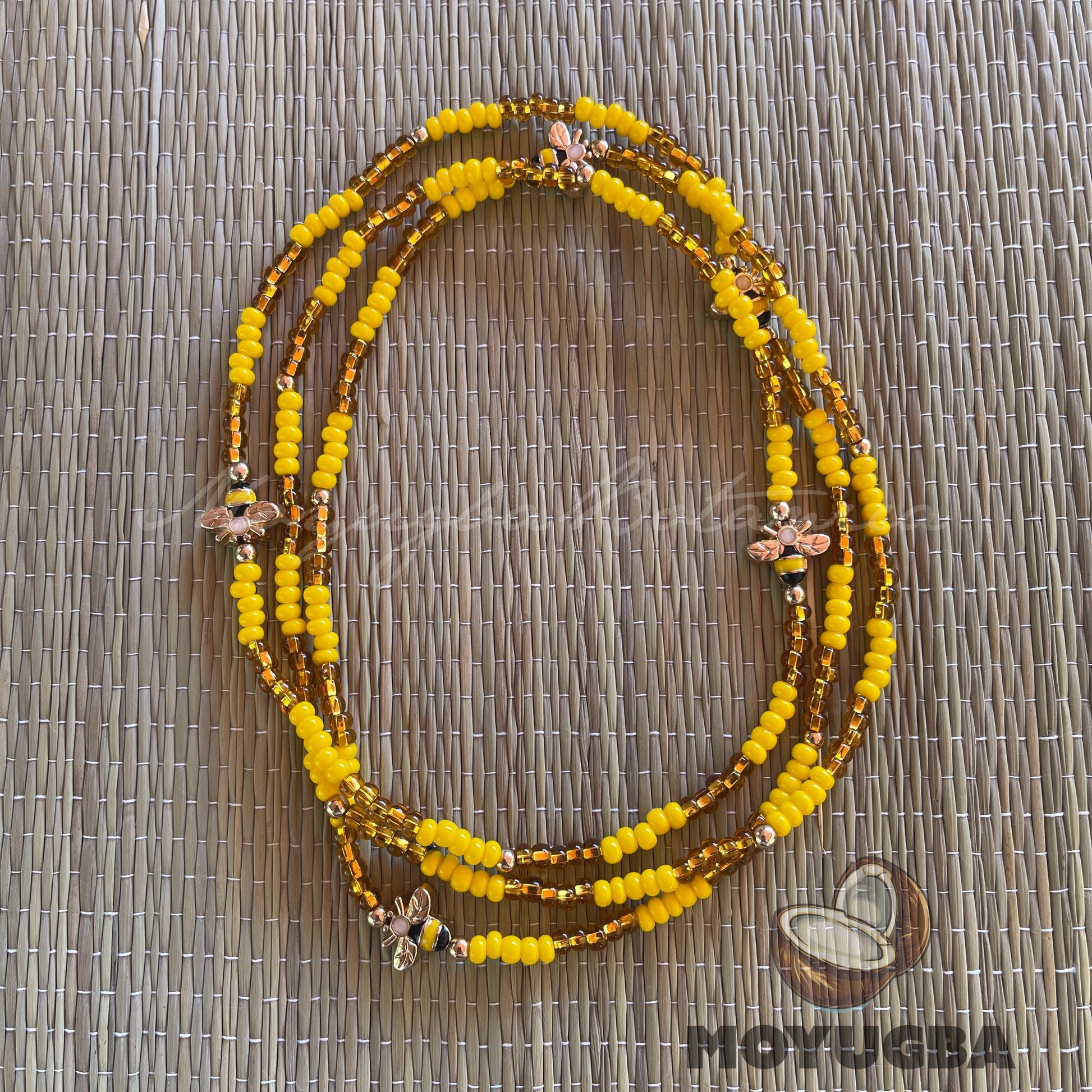 Adorn yourself with the beauty and energy of this Oshun necklace with bee charms, inspired by the goddess of love, beauty, and fertility. This necklace details and vibrant colors yellow and amber beads with 5 bee charms representing her number. Handcrafted with care.
