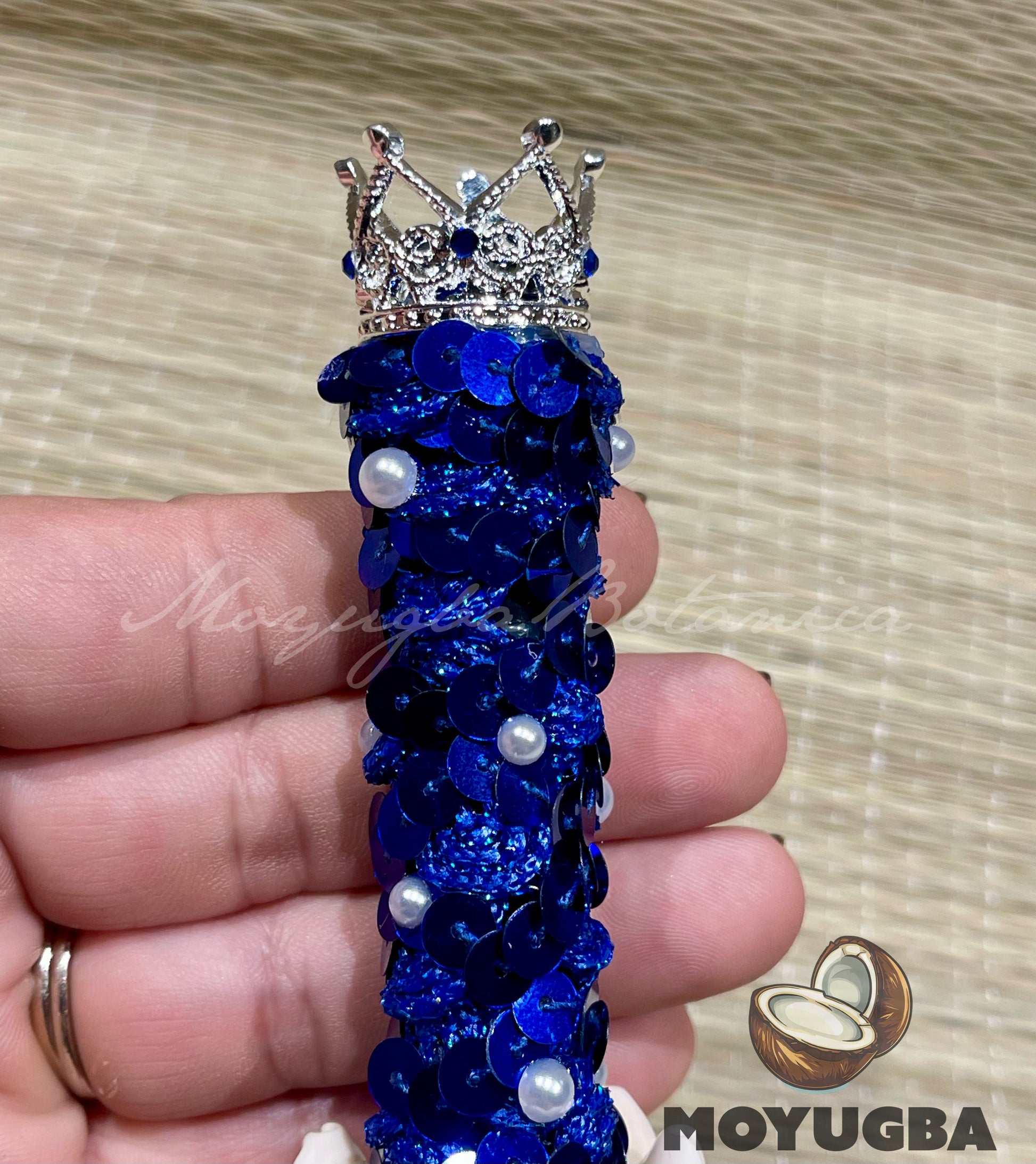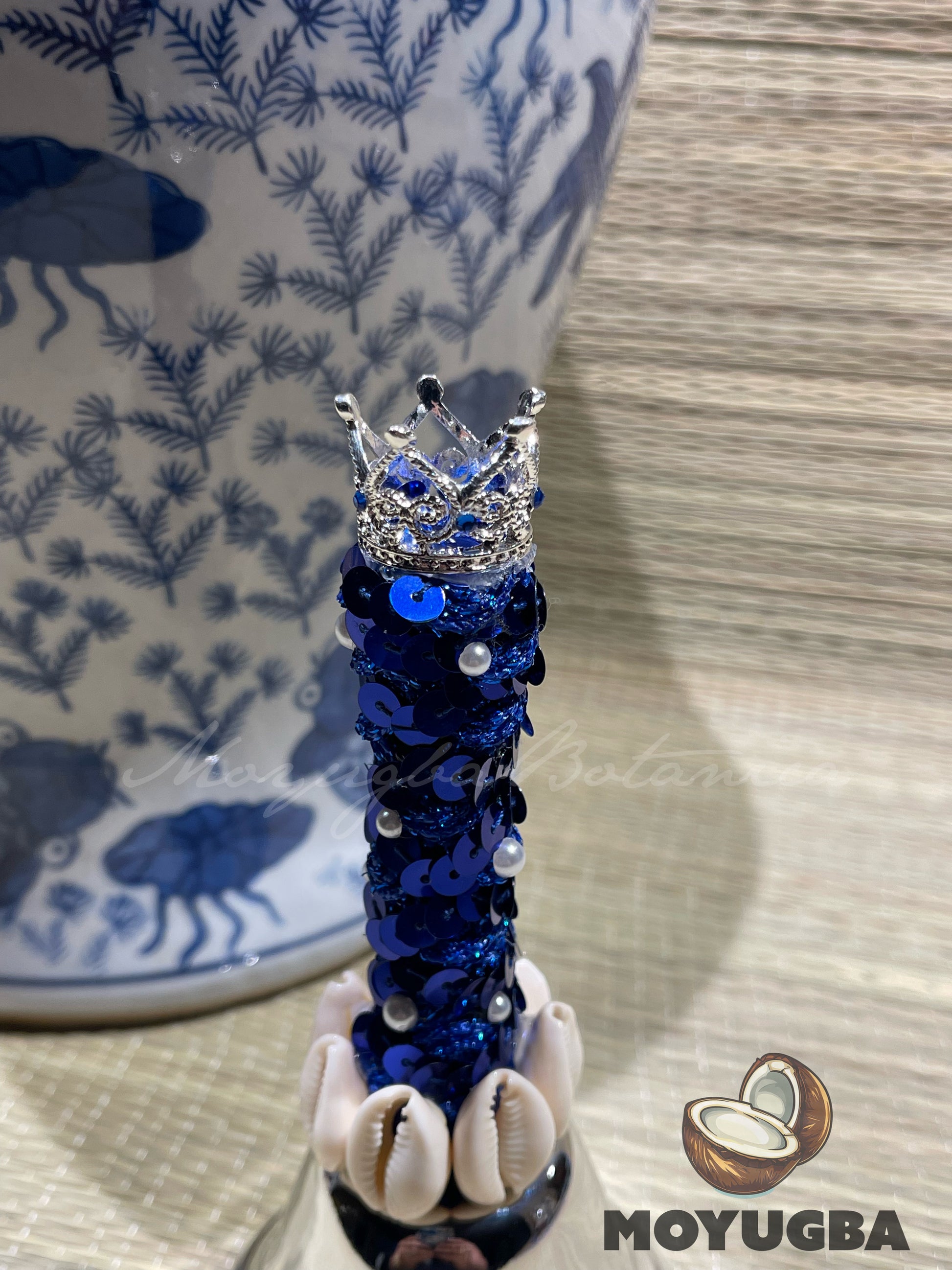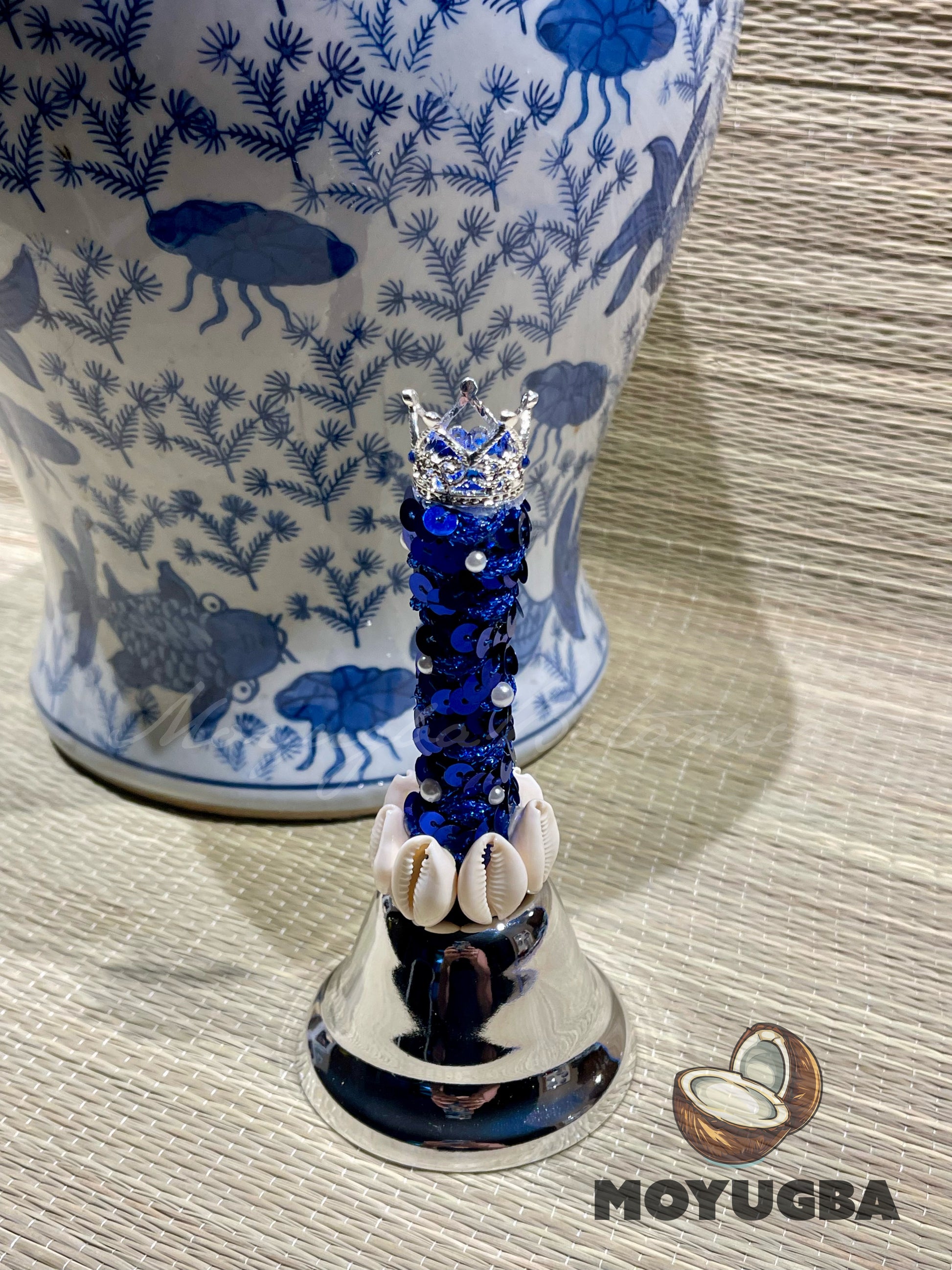 Embrace the divine energy of the ocean with our Olokun/Yemaya Bell, adorned with pearls and 7 cowrie shells, perfect for Santeria and Yoruba practices. Standing at 5.5 inches tall, this stunning piece features rhinestones elegantly added to the crown, enhancing its beauty and spiritual significance. Available in a beautiful silver finish, it’s an exquisite addition to your altar or home decor. Channel the protective and nurturing vibes of Olokun/Yemaya.